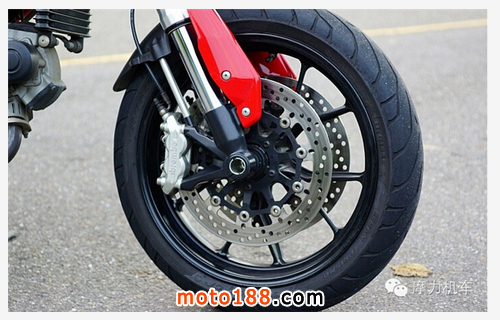 位于后搖臂前上端的 Sachs 預載及阻尼可調避震,行程 135mm,路感輕柔確實,并且也方便調整,以入門的 DUCATI 而言,算是非常有誠意的。