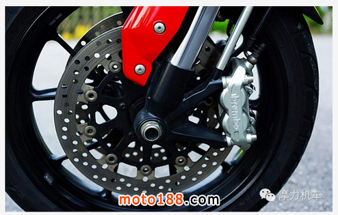 前卡鉗采用 Brembo P4 對向式四活塞輻射卡鉗,剎車力道堪稱中上,面對輕量化的車身,這樣的配置已經足以使用,也能面對偏激烈的操駕,碟盤則也是 Brembo 代工的 305mm 浮動式碟盤,無浪花邊的設計,讓剎車過程較不容易產生噪音。