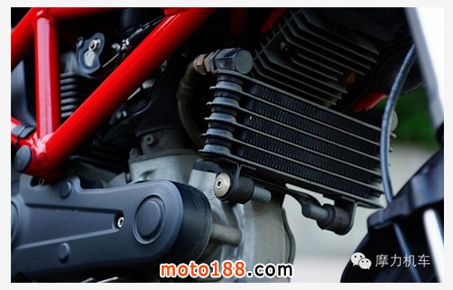 而位于引擎前方撞風面,是機油的冷卻冷排,雖然這顆引擎為空冷引擎,但是機油溫度也需要適當的冷卻,避免機油因為引擎高溫而裂解,造成吃機油等情況發生,另外儀表板中央的溫度表部份,顯示的也是機油溫度,而不是引擎溫度,可見在空冷引擎下,機油也是一個重要的散熱媒介。