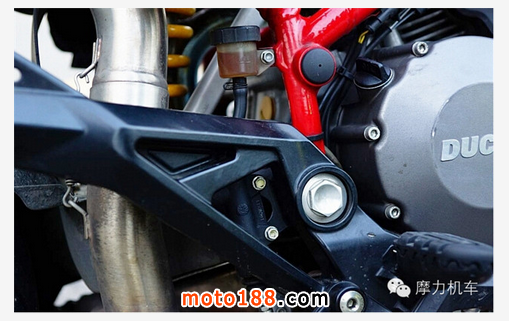 接著看到被稱為 L 型雙缸的 V型90度雙缸引擎,這顆由 DUCATI 制作的雙缸引擎,在 8000rpm 時能爆發出 81hp 的馬力數值,而在 6250rpm 時則能提供 7.7kg-M 的扭力輸出,對于這樣輕量化的車體而言,帶來的樂趣已經非常多。