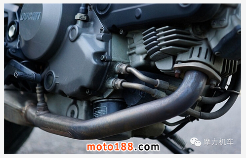 因為是V型90度雙缸引擎,因此排氣管為一缸獨立一支,這邊則是前缸的排氣管頭段。