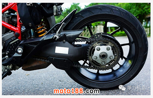 DUCATI 獨家的 Desmodromic 氣門技術,氣門的開啟或關閉都僅靠凸輪軸推動,并在 Hypermotard 796 以及其他大多數 DUCATI 車款舍棄內鏈,改以正時皮帶拉動氣門凸輪軸,另外在 Hypermotard 796 上僅有單凸輪軸設計,因此缸頭體積,以及引擎重量都可獲得輕量的效果,圖中的黑色蓋子,就是驅動 Desmodromic 凸輪的外置式皮帶護蓋,內部采用與汽車相同的正時皮帶設計,相信設計師絕對有他的理由。