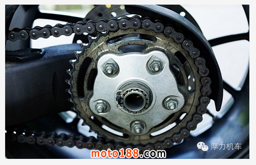 輪座采用鋁合金材質,齒盤為41齒數,鏈條原廠搭配則是由 DID 所制作的油封鏈條,規格為 525HV2,共104節。