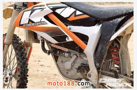 當你跨上FreerideE時,你完完全全能感受到各個部件配合得天衣無縫的感覺。盡管它的動力裝置與傳統感覺不一樣,但它的鋼鋁結合的車架有著優秀的人體工程學,使得駕駛者騎乘姿勢非常棒。車輛座高為大約35英寸,所以感覺車子大小比較適中,相比一輛250CC四沖程摩托它更像一輛85CC的摩托。車把和腳踏位置合適,除了平坦的坐墊,它就像傳統的越野摩托一樣。非常有趣的是,KTM從胡薩博格借鑒了它高強度塑料副車架的技術。此外它使用了85 sx的減震,因此它的209磅的車重操控也十分扎實。當沖進粗糙路面和從坡上往下沖時,我注意到車輛穩定性非常好,阻尼表現得非常優秀。WP PDS對震動過濾非常快速,使得你感覺沖擊似乎要小一些,但是它仍需要進一步的調教,使得快速過彎沖擊較大時減震不至于壓縮太多。