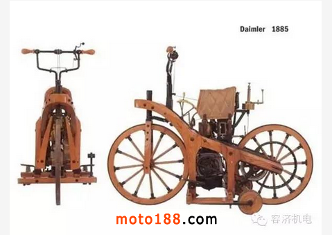 我們今天騎的摩托車,其實在100多年前就被發(fā)明出來了。1885年戴姆勒制造出一臺氣冷型直列單缸二沖程內(nèi)燃機,最大功率0.38千瓦。他將這臺發(fā)動機安裝在由橡木制成的車架和木制車輪的雙輪子車上,制成了實際上是世界上第一輛摩托車,最高時速可達(dá)12公里。