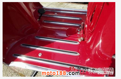 精致的鍍鉻裝飾條與腳踩后剎車踏板,在當時這類踏板車的后輪大都采用著腳剎車的方式。