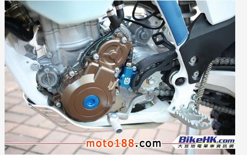 眼前的FE250有不少都是后加的配件,基本上車身的藍(lán)色金屬配件都屬額外補(bǔ)品。車架兩邊的藍(lán)色防滑貼也是后加補(bǔ)品,而最漂亮的莫過于兩邊水箱的Husqvarna標(biāo)志貼。前制動加上了保護(hù)蓋,圓片剛好保護(hù)了菊花碟,但又不會防礙散熱。車底的保護(hù)片是必備的選擇,而這一保護(hù)片更提供了大范圍的保護(hù)。