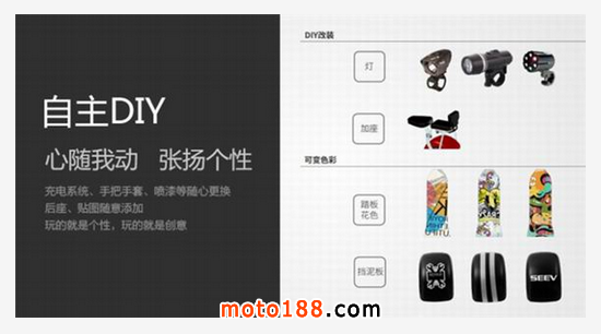 同時,為了迎合年輕人的個性需求,Citycoco還可以自主DIY,讓用戶根據(jù)個人喜好,完成產(chǎn)品改裝,只需動動手指,瞬間變身改裝達人。充電系統(tǒng)、手把手套、噴漆等隨心更換,后座、貼圖也可以隨意添加,讓用戶玩的就是個性,玩的就是創(chuàng)意。