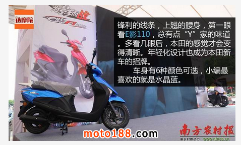 鋒利的線條,上翹的腰身,第一眼看E影110,總有點“Y”家的味道。多看幾眼后,本田的感覺才會變得清晰。年輕化的外形設計也成為本田新車的招牌。