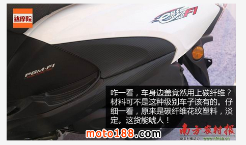 咋一看,車身邊蓋竟然用上碳纖維?材料可不是這種級別車子該有的。仔細一看,原來是碳纖維花紋塑料,淡定。這貨能唬人!