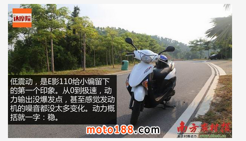 低震動,是E影110給小編留下的第一個印象。從0到極速,動力輸出沒爆發點,甚至感覺發動機的噪音都沒太多變化。動力概括就一字:穩。