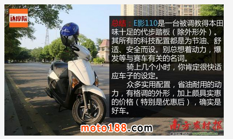 總結:E影110是一臺被調教得本田味十足的代步踏板(除外形外)。其所有的科技配置都是為節油、舒適、安全而設。別總想著動力,爆發等與賽車有關的名詞。