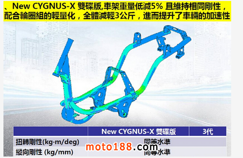 精心的改良增強了這新型號的起步加速和超車加速性能,但CYGNUS-X雙碟版很巧妙地以新增後碟煞所提升的制動 力來平衡增強了的扭力和加速性能,且將前後煞車比例設定為兼顧安全性與運動性的7:3,來提升操控之安全。