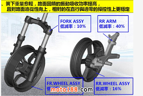 車架方面,重量減輕了5%且維持相同剛性,配合全新五爪輕 量化輪圈,令全車減輕了3公斤。