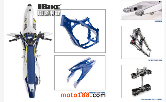 重新設計的鉻鉬鋼框架車架,車架以壓鑄成型,再用鐳射切割和機器人焊接的,更輕更緊湊。無論是抗扭剛性和縱向剛性均有所提升。加上全新的三件式碳纖維副車架 和全新的鑄式鋁合金搖臂,確保HUSQVARNA越野車無可匹敵的平順性與易用性。
