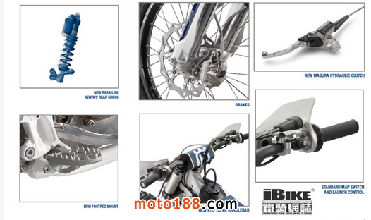 機器殼以精密的數控車床加工,還有WP 的 4CS前叉,輕了500克的WP尾避震和經過改良的多連桿設計,改善了懸掛系統的阻尼和平衡。確保在不過情況和地形上,都有最佳的牽引和控制。