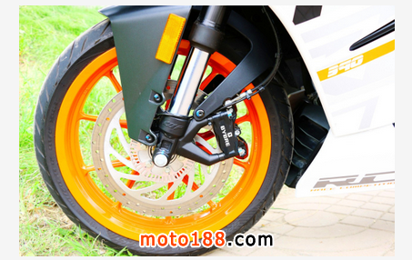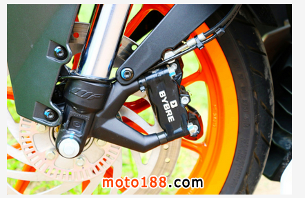 前制動:四活塞,徑向固定式卡鉗,直徑300mm制動盤。后制動:單活塞浮動卡鉗,直徑230mm制動盤。輔以BOSCH 9MB雙路ABS所組成的“BREMBO血統”制動系統,足以應對其自身動力的“瘋狂”,大培子特意在100km/h時速的情況下對RC390進行緊急制動,實際制動效果妥妥的。