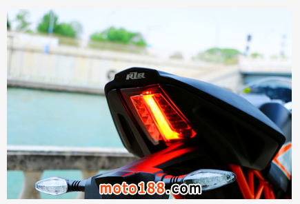 橙色編織管式車架和輪轂,使得RC390分外亮眼!43mm倒置式WP前減震,一體鑄模后搖臂,看著心里都踏實。大燈線性輪廓?根本不要!新穎的復式導流罩、“赤裸裸”的雙透鏡遠近光燈配合“獠牙”般的LED日行燈,仿佛在警示:別招我啊!排氣被整合在下導流罩內,重心下移并使布局更加緊致。乍一看RC390貌似是單座設計,沒有后座!近距離方能發現RC390為了配合跑車的定位,將后座“隱蔽”了起來。俗套的后座扶手被一個隱藏于后座下的把握槽所替代。RC390的尾部設計搭配了另類的LED尾燈讓它顯得出奇的簡潔明快。RC390整車線形與大排量跑車無異,鋒利且更具動感。