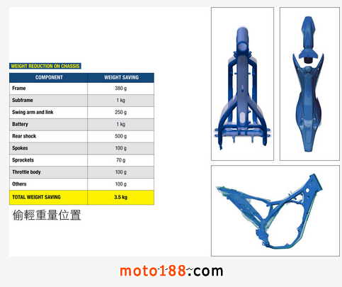 全新起動系統更有效率且比前輕量150g,使用小巧的韓國三星鋰電池后,整體減磅超過1kg,重新電池與電線佈局令維修更方便,只需拆除副架的數枚鑼絲即可。