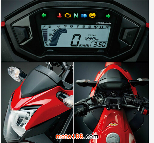 CB250F有全新設計的表板和頭燈,當然還有街車化較高的轉向把手。至于車尾部份、死氣喉和前后座位連扶手都沿用CBR250R跑車設計。