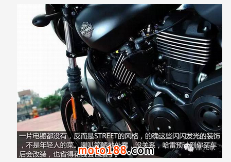 我懷疑他們造車的理念是:按照老祖宗留下的配方,用最好的材料,前輩的教誨,建造出一部摩托車,至于這部車能發出多少馬力,是不是好騎,甚至踩下剎車能不能及時停下來,都是不重要的。STREET似乎沒了這些固執,是最容易上手的一部哈雷。離合器和油門,從行程到響應,都是很好適應的,用某位資深哈雷車主的話:“和騎一部日本車沒啥區別”。