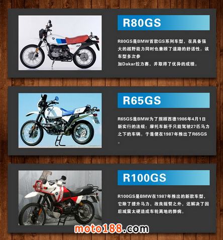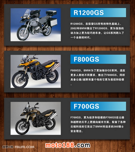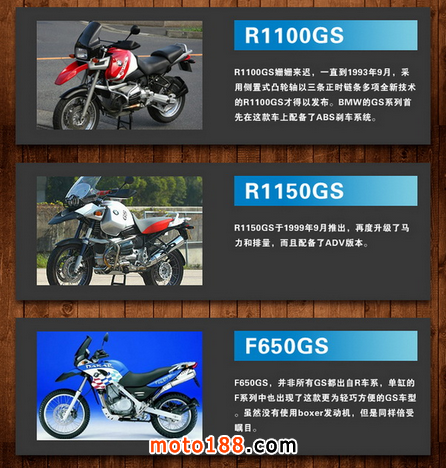 R65GS/R80GS/R100GS/R1100GS/R1150GS/R1200GS/F650GS/F800GS/F700GS,迄今為止,GS系列中九個車型已經在全球銷售近百萬臺。在這個擁有單缸、直列兩缸和boxer發動機的車系中太多的傳奇在延續,太多的故事在講訴。毫不夸張的說:GS在啟發著全地形摩托車這個市場!能見到摩托車的地方就有GS,看不到摩托車的地方仍有GS。