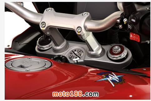 ●2015 MV Agusta Turismo Veloce 800標準版採用傳統的全調校Marzocch倒立前叉,回彈、下壓及預載一應俱全。