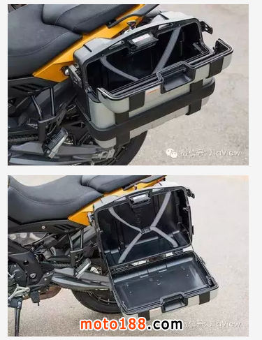 兩個行李邊箱看上去非常的結實,而且設計非常巧妙,既可以從頂部打開,也可以像一般的邊箱一樣從側面打開。側面打開有利于車主存儲大型的物品。缺點就是一打開,里面的東西可能就會滾出來。從頂部打開的話,可以方便車主拿取小物件。總之,兩種方式供騎士選擇,結合在一起給車主騎行提供更大的便利。