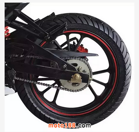 紅色輪圈寬鋁合金車輪,配置扁平真空輪胎(110/60-17、140/60-17),防爆防扎,安全耐用;