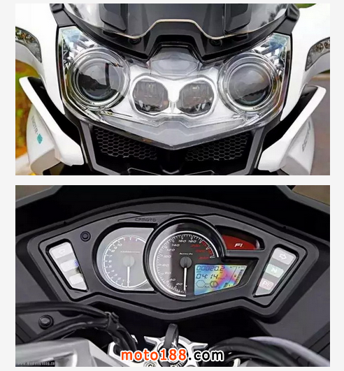春風(fēng)650TR-G采用了面積更大的電動(dòng)升降風(fēng)擋、WP倒立式可調(diào)前叉、后減震還有來自西班牙的J.JUAN制動(dòng)系統(tǒng)和功能更強(qiáng)大,視覺效果更好的多功能液晶儀表。而更吸引眼球的全LED大燈、LED轉(zhuǎn)向燈和LED光帶式尾燈。