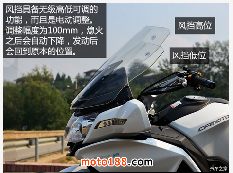電動可調(diào)風(fēng)擋是650TR-G傲人配置之一,國產(chǎn)車中應(yīng)該沒有其他車有這種配置。有了這個風(fēng)擋,能確保騎士在長途旅行中不被氣流沖擊,有效減低疲勞感,而且具備電動升降就代表你不用因為要調(diào)整風(fēng)擋而停下車。我在騎行中試著將風(fēng)擋調(diào)到最低與最高,發(fā)現(xiàn)差異還挺大的,如果調(diào)到最低,氣流直接吹到我的胸口,調(diào)到最高的話,氣流則剛好從頭頂上方經(jīng)過,如此一來能夠讓氣流正好吹進頭盔的風(fēng)道里增加通風(fēng)效果,又不至于讓頭部受到太多的氣流沖擊。