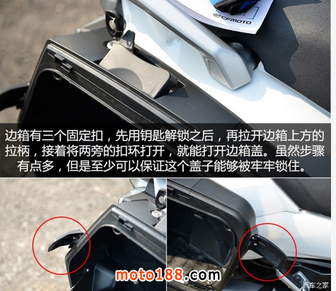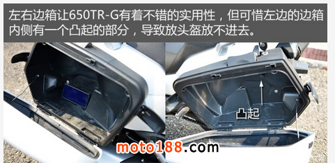 650TR-G的邊箱容積不小,可以放得下很多出行時所用的裝備,唯獨左邊的邊箱中間有一個凸起的地方,妨礙了頭盔的存放。如果你覺得這兩個邊箱還是不夠你使用的話,你也可以選購尾箱(后市場改裝用品)。不過,我想這兩個邊箱應(yīng)該可以滿足多數(shù)人的需要。