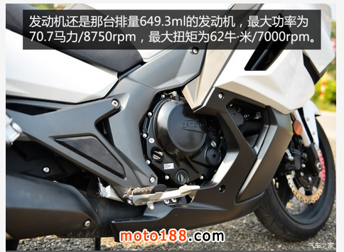 發(fā)動機雖然輸出功率沒有改變,但是現(xiàn)場650TR的車主在試駕650TR-G后宣稱,650TR-G的發(fā)動機轉(zhuǎn)速提升較650TR更加迅速。根據(jù)原廠所提供的信息,650TR-G的0-200米加速是8.1秒,而650TR是11秒。不過原廠只有強調(diào)本車使用博世的電噴系統(tǒng),并沒有說明在發(fā)動機上做出了哪些改變。