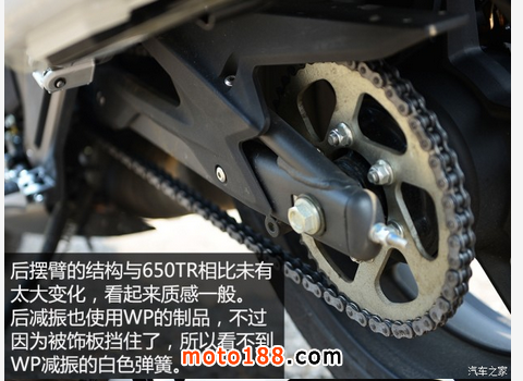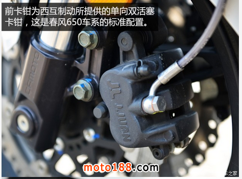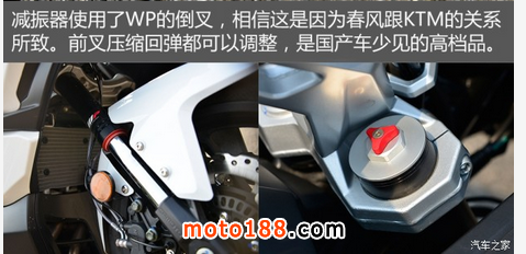 至于車輛的其他細(xì)節(jié),我個人認(rèn)為還算是對得起它59800元整的售價,做工比起650TR似乎又更細(xì)致了些。另外,在配置方面還有一個亮點,那就是春風(fēng)與知名減振器大廠WP合作,為它配上了可調(diào)式前叉,后減振也是WP的產(chǎn)品,至于實際體驗的感覺,我們將會在體驗的環(huán)節(jié)中提到。
