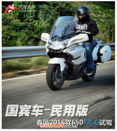 國賓摩托!不僅聽上去就非常“高大上”,而且還給人一種尋常百姓“只可遠觀不可褻玩焉”的感覺,想擁有一輛“國賓車”是摩托車愛好者的一個夢……而如今,夢想照進了現(xiàn)實。在9月3日中國紀念反法西斯戰(zhàn)爭勝利70周年大閱兵隊伍的前列,中國武警摩托車禮賓方隊45名隊員駕駛國產摩托車為抗戰(zhàn)老兵護衛(wèi),讓全國以及全世界都眼前一亮。而這些帥氣國賓車,其實很多人不知道其出身,讓我來告訴大家,“神秘”國賓車其實是真正的國貨,由浙江春風動力生產。而“93”閱兵后的9月12日,春風公司在“全國授權經銷商發(fā)布會”中正式發(fā)布了這款國賓車的民用版:2016款650TR-G,價格方面也給我們帶來了驚喜:59800元!