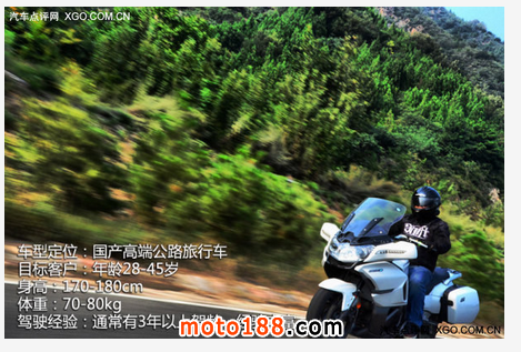定位是國產高端公路旅行車,主要適合的目標客戶年齡在28-45歲。比較適合的身高范圍在170-180cm,體重:70-80kg左右身材的騎士。此類大排量,車身較大、車重較大的高端休旅車,其實并不適合新手,比較適合有3年以上駕齡,且擁有較為豐富的駕駛經驗的車手。
