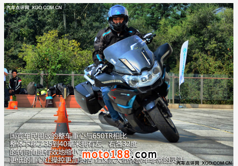 雖然這款車型車身長度超過2.2米,寬度也接近1米,但是得益于與650TR相比整體下移了35到40毫米的車身高度與黃金配比的車身重量:空車狀態(tài)下前、后輪各自承擔車身50%的重量,單人駕駛時前輪配重為45%,后輪配重為55%,使得650TR-G在操控性和穩(wěn)定性方面具備了先天優(yōu)勢。依靠馬牌輪胎出色的抓地力,無論是擁擠的城市行駛還是山路壓彎,這款大型的休旅車都給我感覺非常的靈活。