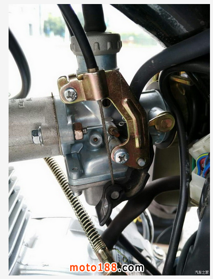 首先是發動機,代號是f28的125ccCC發動機。其實就是建設雅馬哈的yb125系列,所有零件都通用。只是配套廠沒有雅馬哈的好。聲音因為有平衡軸所以挺雜的,就是不像過去老車有那種節奏感。不過是真的沒有震動,因為還沒出首保所以我最高也就跑到5000轉,平常就4000轉換擋行車。5檔4000時速是50km/h油門大概是5%-10%的行程,我帶上頭盔只能聽見風聲發動機和排氣幾乎剛覺不到。現在已經跑了590km左右,平均下來的油耗大概是1.5左右,應該說相當省油了吧。風門我從來沒拉過,買來后也沒調過化油器。都是一下就著車。化油器上有tk japan的刻字不知道是什么牌子的。著車以后怠速特低感覺就要熄火似的。