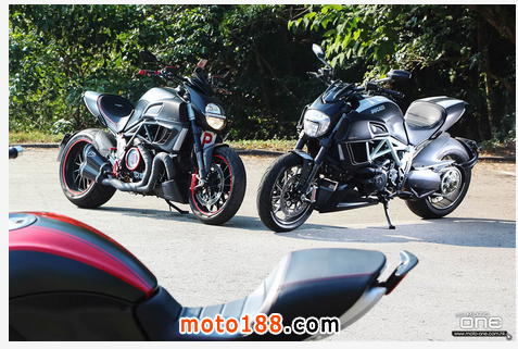 ●左是第一代DUCATI DIAVEL(輕量改裝),右是2014 DUCATI DIAVEL CARBON,較明顯分別是採用了新設計的頭燈。