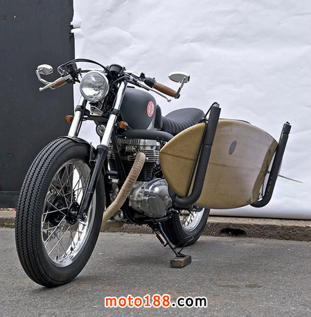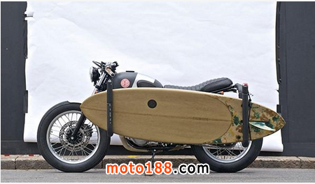 這款摩托車并不算是強壯肌肉型,它是為沖浪人群專門設計的,澳大利亞的陽光沙灘才是它的終點。它的外形在描述著浪花,也是簡潔大方的代名詞,還可以定制貼心的沖浪板支架。深紋路輪胎減震性能良好, deus ex-machina的設計師們也用一個循環式汽化器代替了車上所有的空氣通風系統。