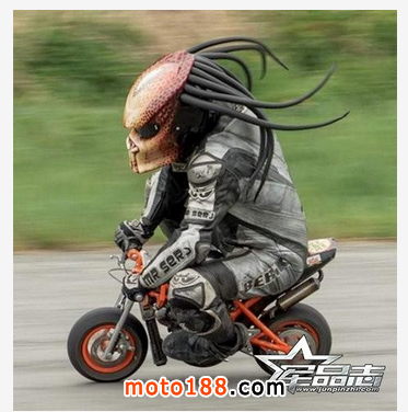 在《鐵血戰士》系列影視作品中,那個頭戴面具、身披鎧甲、手持矛槍、行動敏捷的遠古外星生物鐵血戰士(predators,英文原意為“捕食者”)給我們留下非常深刻的印象。鐵血戰士光顧地球與人類為敵,之后轉而又與異形(Alien)斗爭,這個角色一次次挑戰著觀眾的視覺極限,讓人們大呼過癮!如果有一天,你看到公路上有與鐵血戰士“相似”的騎士駕駛摩托飛奔,不要為此感到驚慌,這名騎士正是佩戴著Nitrinos推出的創意裝備——鐵血戰士頭盔。