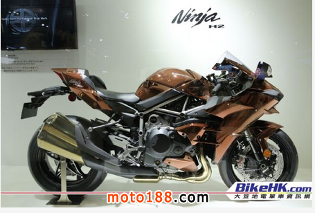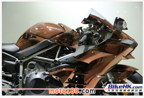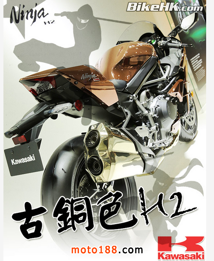 Kawasaki的H2除了那臺超級增壓引擎之外,銀鏡處理的擾流就成為了它的象徵。大家都見識過暗黑色的H2鏡面啡呤,在東京車展內Kawasaki特別展出了一臺古銅色鏡面H2,全套擾流仍然用鏡面處理,但卻混入了古銅色。在撇開綠色之外,原來也可以很好看!