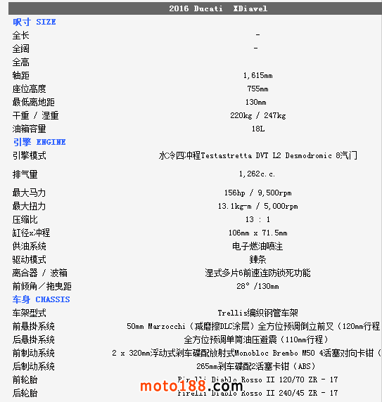 昨晚深夜,DUCATI在意大利舉行2016新車發(fā)布會,一口氣展出多款新車,而壓軸是全新Ducati XDiavel S,新車的焦點是首部采用皮帶傳動的DUCATI,其余裝備還有Desmodromic Variable Timing (DVT)搖臂式可變正時控制系統(tǒng)、多段調(diào)校的座姿、DPL彈射起步及強勁的低扭輸出等等。