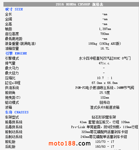 使用直2引擎的CB500F,市場定位是給新手升級之用,但對一般老手來說屬實用型NK街車。由于廠方沒有提供新車的馬力及扭力數字,再者車輛主要在外型上改良,相信馬力及扭力與上一代相約,而舊款的最大馬力是47.5ps / 8,500rpm,扭力則是4.4kg-m / 7,000rpm。