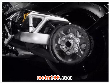 全新Ducati XDiavel S排量由上一代的1198.4mL增加到了1262mL,但由于增加了扭矩所以馬力有所下降,當轉速達到5000轉時就能爆發出128N·m,即使是比怠速稍微高一點的2100轉也能有98N·m的輸出,真可謂是扭力之王!這么大的扭力如何控制,杜卡迪也為你想到了,新款Ducati XDiavel S裝備了慣性檢測系統(IMU)和杜卡迪當家的搖臂式可變正時控制系統(DVT),有效的為你控制油門。而以此衍生出來的杜卡迪專屬彈射起步系統(DPL)更是此車的亮點,只要掛上一擋,擰動油門,電腦就會自動計算出當前的最大馬力輸出,并讓循跡系統介入,避免發生翻車意外。杜卡迪這功能即增加了可玩性、又保證了安全,兩全其美。