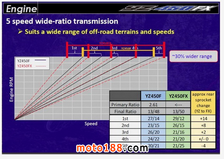 先來說說這臺449cc排量的發動機,YZ450FX的發動機和YZ450F使用的是相同的水冷四沖程機器,同樣采用了鈦合金氣門,壓縮比也是相同的12.5:1,節氣門使用的也是Keihin 44mm規格。當然作為一款定位更加激進的場地越野車,雅馬哈還是對這臺發動機進行了一些升級,比如更加方便的電啟動系統,當然這一升級在外觀上的變化是幾乎難以察覺的。此外,FX車型的ECU也進行了重新調校,除了保證電器系統的正常工作之外還有了不同風格的動力輸出。值得注意的是,雅馬哈也會將這套ECU程序單獨出售給WR450F車主,想必這也是后者正需要的。