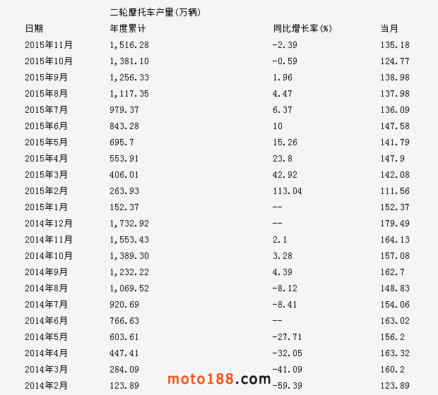 以下為2014-2015年我國(guó)二輪摩托車產(chǎn)量統(tǒng)計(jì)表: