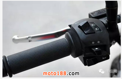 右側把手開關,主要的引擎熄火開關跟下方的電發開關,塑料的材質搭配黑色烤漆,簡單明了。握把采用顆粒的防滑握把,抓握起來軟硬適中,不會有過硬或者偏軟容易磨耗的問題。