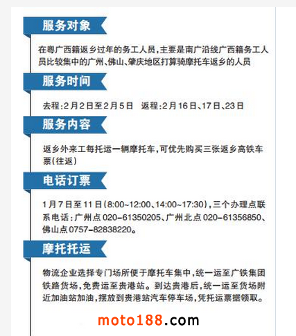 每年春運(yùn),我市都會出現(xiàn)浩浩蕩蕩的摩托車返鄉(xiāng)大軍,在返鄉(xiāng)途中經(jīng)常面臨各種安全隱患。昨天,廣鐵集團(tuán)公布了“為廣西籍異地務(wù)工人員乘坐高鐵、托運(yùn)摩托車返鄉(xiāng)提供便利服務(wù)”方案,活動服務(wù)對象包括在粵務(wù)工廣西籍返鄉(xiāng)過年的務(wù)工人員,主要是南廣沿線廣西籍務(wù)工人員比較集中的廣州、佛山、肇慶地區(qū)打算騎摩托車返鄉(xiāng)的人員。廣東物流企業(yè)等將提供免費(fèi)托運(yùn)摩托車捐助服務(wù),托運(yùn)區(qū)間為廣州、佛山至貴港。