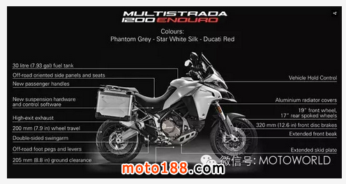 今天為大家深度解析的是2016年度杜卡迪推出的Multistrada最新款車型~ Multistrada 1200 Enduro,相信這也是與國(guó)際絕對(duì)同步的節(jié)奏了。Multistrada 1200 Enduro是一款具有超級(jí)性能的杜卡迪,它被賦予重任,預(yù)計(jì)在未來與寶馬、KTM等對(duì)手展開一場(chǎng)激烈異常的市場(chǎng)“爭(zhēng)奪戰(zhàn)“。